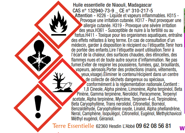 La législation européenne demande (sauf si vendu en tant qu' "arôme alimentaire") pour les huiles essentielles d'afficher des logos et des phrases d'avertissement si elles sont vendus en tant que "produit à diffuser" ou "produit chimique".