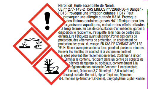 La législation européenne demande (sauf si vendu en tant qu' "arôme alimentaire") pour les huiles essentielles d'afficher des logos et des phrases d'avertissement si elles sont vendus en tant que "produit à diffuser" ou "produit chimique".
