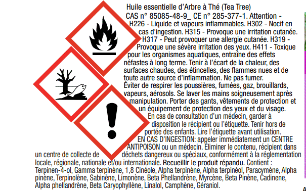 La législation européenne demande (sauf si vendu en tant qu' "arôme alimentaire") pour les huiles essentielles d'afficher des logos et des phrases d'avertissement si elles sont vendus en tant que "produit à diffuser" ou "produit chimique".