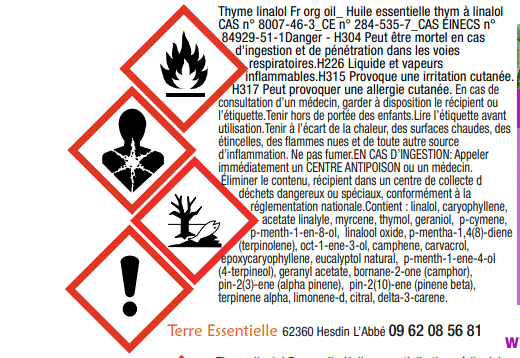La législation européenne demande (sauf si vendu en tant qu' "arôme alimentaire") pour les huiles essentielles d'afficher des logos et des phrases d'avertissement si elles sont vendus en tant que "produit à diffuser" ou "produit chimique".