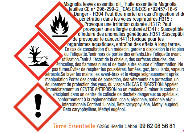 La législation européenne demande (sauf si vendu en tant qu' "arôme alimentaire") pour les huiles essentielles d'afficher des logos et des phrases d'avertissement si elles sont vendus en tant que "produit à diffuser" ou "produit chimique".