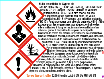 La législation européenne demande (sauf si vendu en tant qu' "arôme alimentaire") pour les huiles essentielles d'afficher des logos et des phrases d'avertissement si elles sont vendus en tant que "produit à à diffuser" ou "produit chimique".