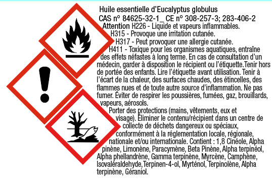 La législation européenne demande (sauf si vendu en tant qu' "arôme alimentaire") pour les huiles essentielles d'afficher des logos et des phrases d'avertissement si elles sont vendus en tant que "produit à diffuser" ou "produit chimique".