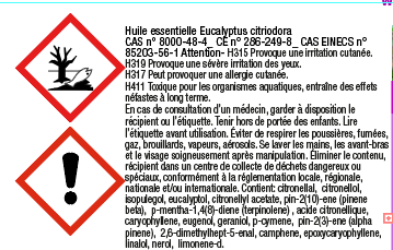La législation européenne demande (sauf si vendu en tant qu' "arôme alimentaire") pour les huiles essentielles d'afficher des logos et des phrases d'avertissement si elles sont vendus en tant que "produit à diffuser" ou "produit chimique".