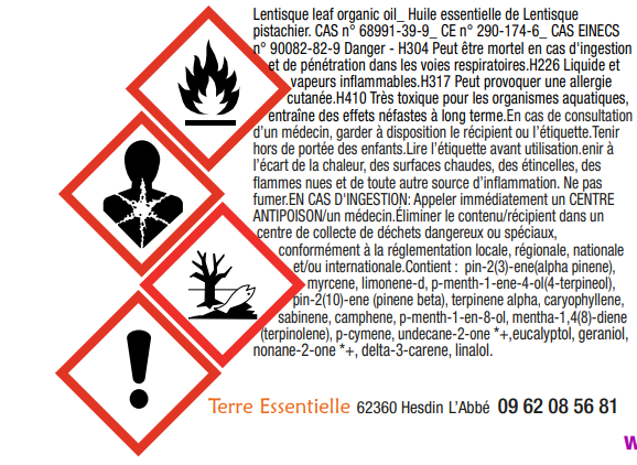 La législation européenne demande (sauf si vendu en tant qu' "arôme alimentaire") pour les huiles essentielles d'afficher des logos et des phrases d'avertissement si elles sont vendus en tant que "produit à diffuser" ou "produit chimique".