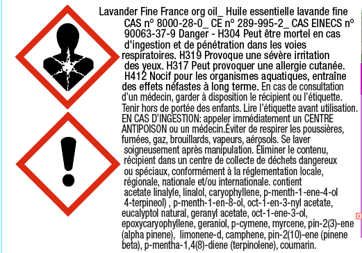 La législation européenne demande (sauf si vendu en tant qu' "arôme alimentaire") pour les huiles essentielles d'afficher des logos et des phrases d'avertissement si elles sont vendus en tant que "produit à diffuser" ou "produit chimique".